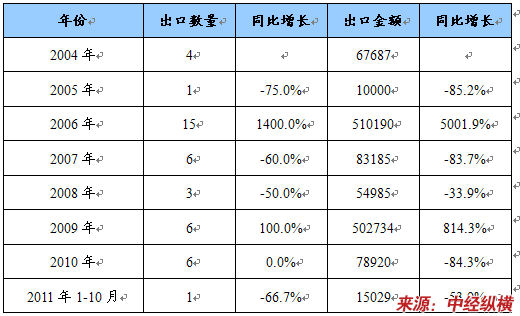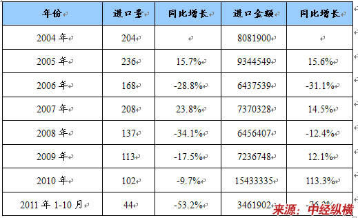 2004-2011年10月中国激光照排机进口数量及金额统计 单位:台,美元