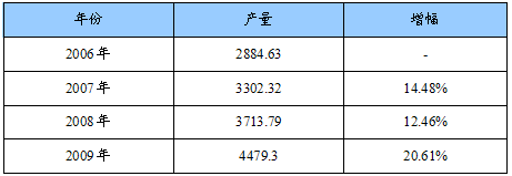 2009年12月国内塑料制品总产量在446.3万吨,较去年同期增加20.9%,2009年1-12月份国内的塑料制品累计总产量在4479.3万吨,较2008年同期增长10.6%。2009年1-12月,我国塑料制品业产量产值均达到两位数增长。2009年1-11月,我国塑料制品业累计实现产品销售收入9354.79亿元,同比增长11.27%,增速比上年同期下降了8.21个百分点。