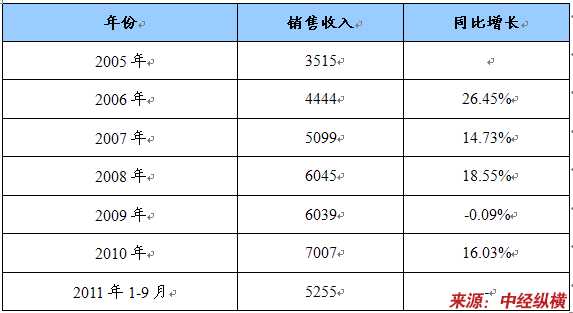 2005-2011年家用护理床销售收入及同比增长 单位:万元