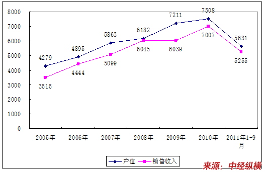 2005-2011年中国家用护理床产值及同比增长 单位:万元