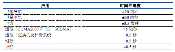 时间同步对于国家经济发展及科学 研究 具有重要意义。在基础 研究 领域、应用 研究 和国民经济活动中有着广泛的应用。在通讯、电力、金融交易系统、航空航天和交通等部门和大型分布式商业数据库中更显突出。不同的应用对时间同步的准确度的要求是不同的,具体如下表所示: