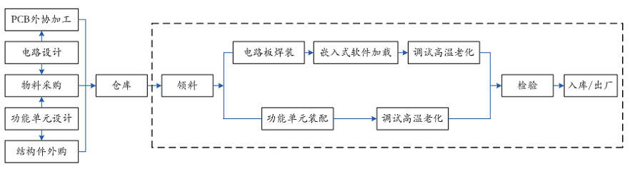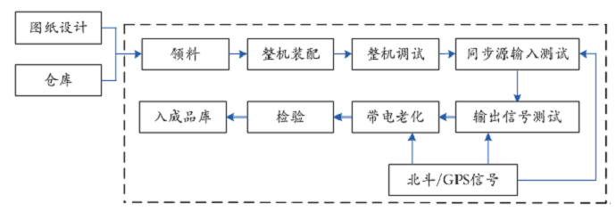 时间同步系统的生产流程,按照图纸要求,将功能单元,以及屏柜、配套电器元件、接收天线等组屏安装,经过加载北斗/GPS 信号下的同步源测试/输出测试,通电老化,检验合格,完成产品生产。