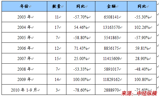 2003-2010年1-9月HS:87053010装有云梯的机动救火车进口情况 单位:辆、美元