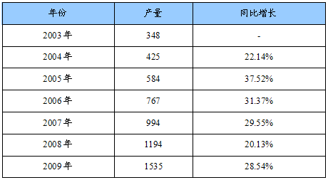 2003-2009年我国汽车中央电器控制盒产量及同比增长统计表