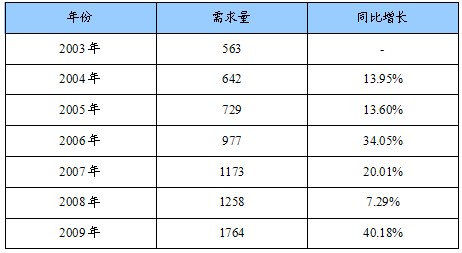 2003-2009年我国汽车中央电器控制盒需求量及同比增长统计表