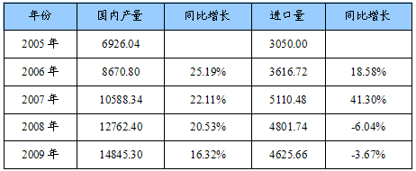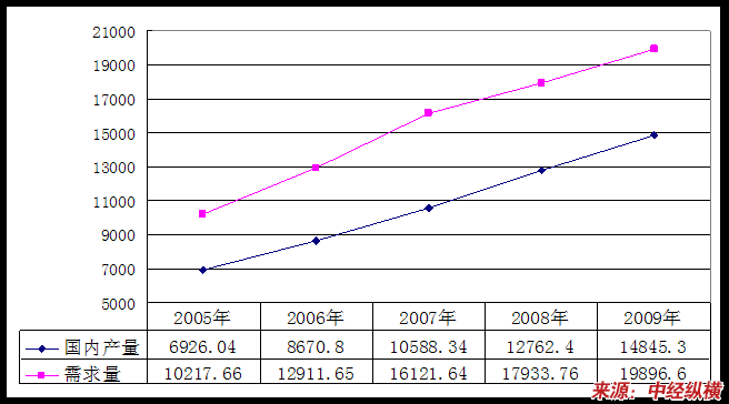 从供需平衡图中可以看出,国内市场需求持续增长,国内产量难以满足市场需求,国内市场呈现供不应求态势。