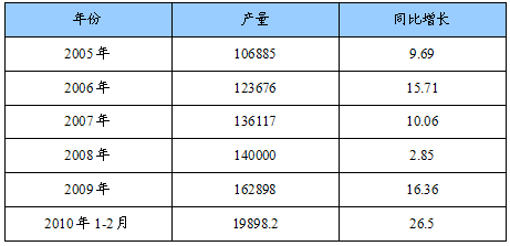 从水泥需求来看,得益于固定资产投资增速的大幅提高,2009年,全国水泥产量162898万吨,同比增长17.9%,增速同比加快12.7个百分点。2010年,在2009年较高的基数上,判断固定资产投资增速相比会有明显的回落。但考虑到基建工程的施工进度以及2010年房地产投资占固定资产投资的比重会小幅上升,单位固定资产投资对水泥需求的拉动效应将高于2009年,估计2010年全国水泥产量增速在10%-15%之间,全年水泥需求增量在1.65-2.475亿吨之间,相比2009年有所减少,但相比过去十年都处在高位。