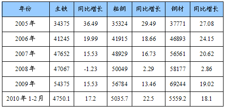 考虑到2010年钢铁生产受宏观形势影响,以及资源、能源、环境制约,国际市场贸易保护主义影响加深,以及社会库存的不确定性等因素,预计2010年我国新增粗钢产能增加3200万吨,产能达到7.5亿吨,粗钢产量将达6亿吨左右,比上年增长6.2%左右。