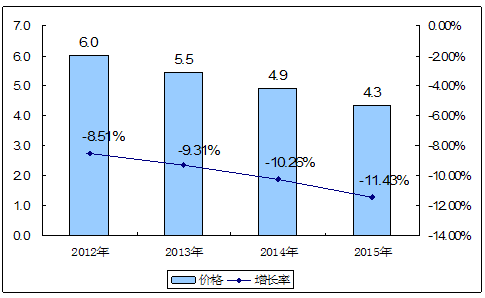 2012-2015年非制冷红外探测器产品价格变化趋势 单位:万元/套