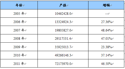 2005-2011年光电子器件产值及增长情况 单位:万元