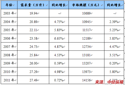 2003-2011年卡尔费休试剂需求量、市场规模及同比增长统计表