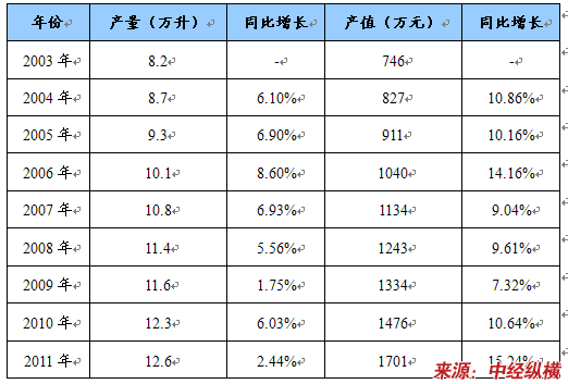 2003-2011年卡尔费休试剂产量、产值及同比增长统计表