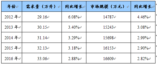 2012-2016年卡尔费休试剂需求量、市场规模及同比增长预测表