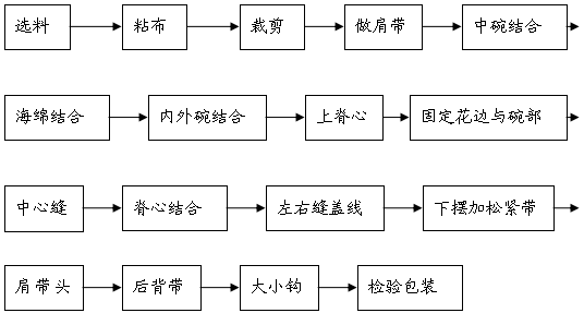 胸罩的生产是群体性集合作业方式。需许多人同时工作才能完成。首先由工艺技术部制定出工艺流程。标准型胸罩的制做时间是每件600秒以上。随款式的简易或繁杂有所增减。市场上流行的柔珠、水袋等功能性胸罩工艺比较复杂,有的每件需2000秒以上。在每件600秒的胸罩工艺中,分为20一30道工序,使用十几种针迹功能的特型缝制机器。每人操作一道工序,由20人至30人组成一条流水生产线。由罩杯芯(无纺布)的合成、上罩面、合缝蕾丝、两罩杯与中心连结、缝制左右护翼(俗称大片、左右、伸片等)、上胸围松紧带缝制、下胸围松紧带缝制、钉缝肩带、包背钩绊、钉装饰花朵、缝制商标、吊牌、结合处打结等等。每道工序都有严格的针迹规范:缝制用线指标、操作手势、工时秒数等工艺指标。从首序到尾序,所有缝制工人,要做到动作均衡,工时协调,速度相等。在制做的同时,还要做好品质的自检、互检和巡检。这样,才能保证每条流水线每天的额定产量和品质指标的完成。