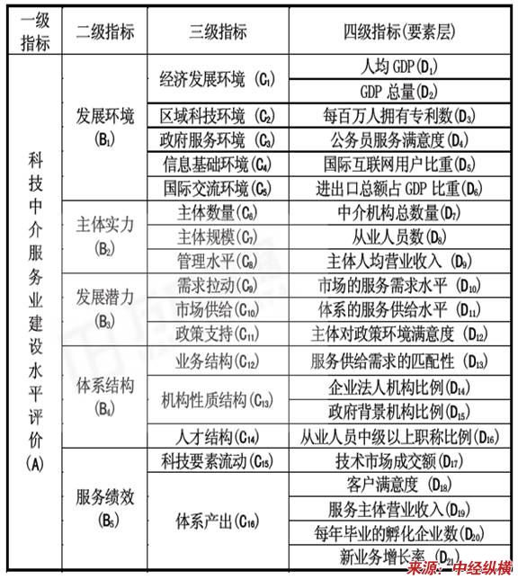 体系结构反映的是科技中介服务体系发展是否均衡合理,我们设计了三个三级指标:业务机构、机构性质结构和人才机构。业务结构用于刻画当地科技中介服务业的业务发展与市场需求的匹配程度,人才结构则着眼于中介服务 行业 的人力资源水平和未来发展潜力。