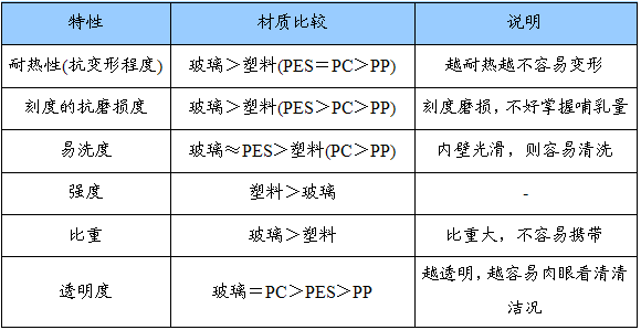 市面上的奶瓶材质,大体上可以分为玻璃类和塑料类。其中,塑料类又包括PC(聚碳酯,也称聚碳纤维)、PES(聚醚砜树脂)、PP(聚丙烯)。