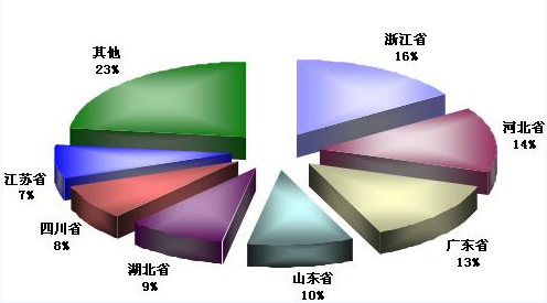国家统计局数据表明,2008年1-5月中国铅酸蓄电池总产量31486467千伏安时,其中产量最高的地区是浙江省,占总产量的16%。其次是河北省,占总产量的14%。山东省占10%。