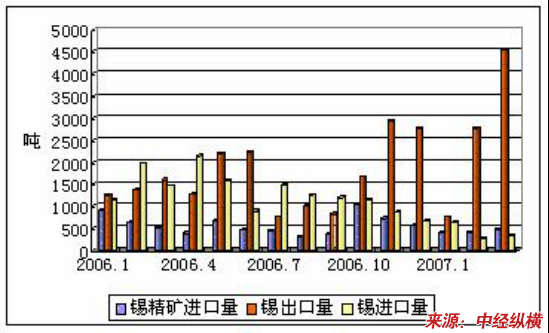 2007年3月份,在国际价格登上14000美元之后,与国内价格形成较大的价差,造成国内出口量大增。3月份锡锭的出口量达到了4537.97吨,与2月份相比增加了63.75%,与2006年同期相比增加了180.61%。3月份是过去三年以来中国单月出口量最大的一个月。中国出口量大增的消息公布之后,对于国际价格也是一个打压。从出口的地区来看,云南的出口量最大,3月份的出口为4161.997吨,其次是广西的贺州地区。目前一些小的企业出口配额已经基本用完,再加上国际价格回调,5月份以后,出口量可能会下降。