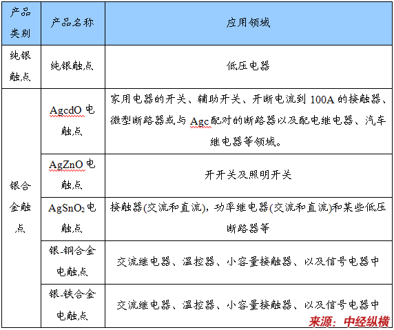 银触点产品包括纯银触点、银银合金三大类主要产品。