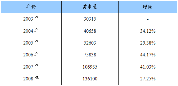 2003-2008年我国高压电机线圈市场需求量及增幅统计表