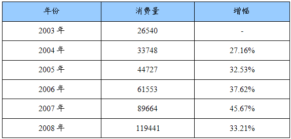 2003-2008年我国高压电机 行业 对高压电机线圈的消费量及增幅统计表