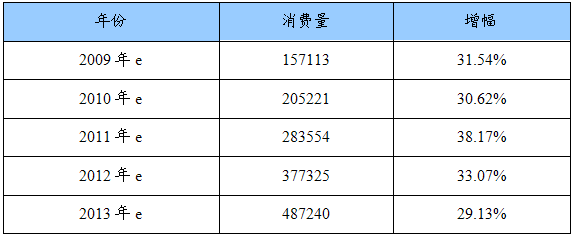 2009-2013年我国高压电机 行业 对高压电机线圈的消费量及增幅预测表