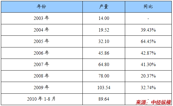2003-2010年1-8月我国消失模铸件产量统计表