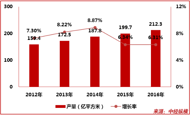 胶粘带广泛应用于建筑装饰、汽车制造、电子电气产品、办公用具、包装、医疗及卫生用品等领域。在下游市场需求的带动下,中国胶粘带产量整体不断增长。2012-2016年,中国胶粘带产量由2012年的159.4亿平方米增长到2016年的212.3亿平方米。