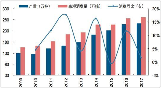 环氧丙烷主要用于生产聚醚多元醇等产品,而聚醚多元醇则主要用于制备硬质和软质聚氨酯泡沫塑料,广泛应用于冰箱、冰柜、隔热板、管道保温、沙发、海绵等领域。受聚醚多元醇产品的旺盛需求影响,环氧丙烷2009-2017年表观消费量的复合增长率达到8.2%。2017年国内环氧丙烷表观消费量约为291.9万吨,同比基本持平。