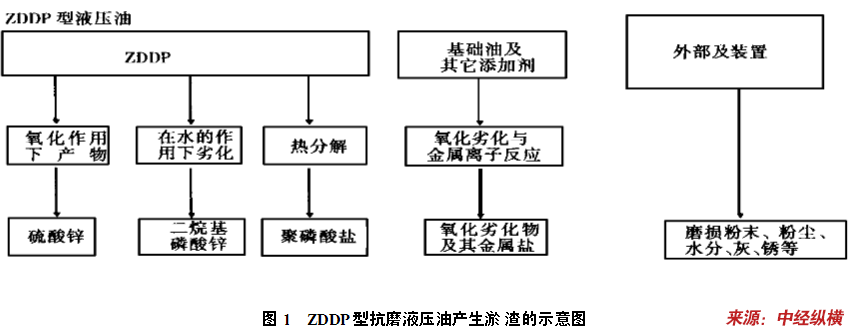 加有抗氧剂(通常是屏蔽酚如2,6-二叔丁基对甲酚)、防锈剂(一般为油溶性较强的有机化合物如烯基丁二酸酯)的抗氧防锈油在某些特定的工作状态下运行良好,从40年代至今仍广泛应用。随着液压系统中使用的叶片泵在工作压力大于6.9MPa时磨损问题的出现,要求油中必须加入抗磨剂以提高油品的抗磨性。最早采用三甲酚磷酸酯抗磨剂虽然对抗磨性有了很大的改进,但与水接触后有形成乳胶和沉淀的倾向。到60~70年代,ZDDP的 研究 成功使抗磨液压油性能有了显著的提高,它除了具备抗磨(对钢-钢摩擦副如叶片泵特别优秀)、防锈和抗氧性能外,还具备良好的水解安定性。1976年,使用ZDDP为主剂配方的液压油出现了问题,当柱塞泵在满负荷状态(2400r/min,93e,34.5MPa)运转时,铜摩擦件表面被腐蚀,产生的淤泥堵塞了伺服阀。而在此之前也发生过类似的问题(含锌抗磨液压油对含银和含铅部件的液压系统有明显的腐蚀作用。此外锌型抗磨液压油在高温、高压条件下使用容易出现淤渣,导致液压系统因控制阀动作不良、滤网堵塞等造成故障。图1给出了ZDDP型抗磨液压油产生淤渣的示意图。 分析 的结果认为与ZDDP的热分解有关。为解决这一问题,不同结构的ZD-DP被开发研制。随后又出现了含稳定ZDDP的锌型油和无锌无灰油。在过去的十年中开发出的新一代抗磨液压油,它符合在同一液压系统中同时存在叶片泵和柱塞泵,并在满负荷苛刻条件和恶劣环境下工作的要求。