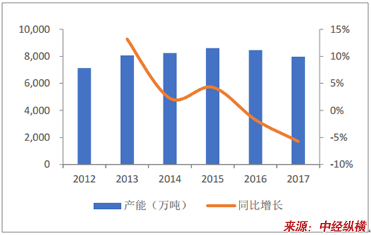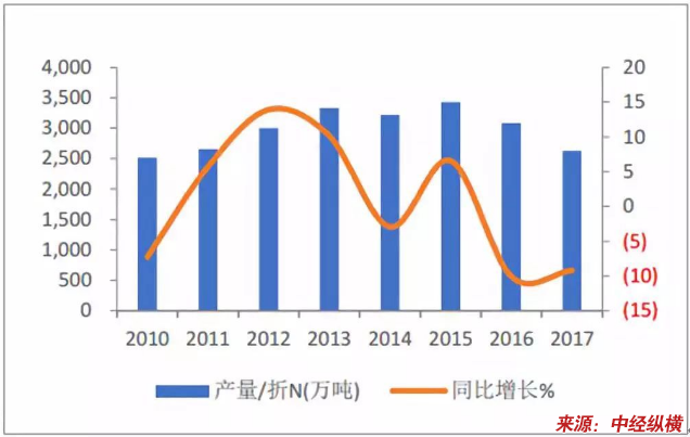 总体来看,尿素 行业 经过多年去产能, 行业 稳定性有所增强。2016~2017年尿素减 产力度大,去产能效果显著。支撑 2016年尿素市场的三个主要因素是产能退出、环保 检查和煤价走高。生产量的收缩是最主要因素,2015年全国长期停车的产能为 516 万吨, 2016年为 542 万吨,2018年百川资讯估计全国尿素产能约 7455 万吨,产能去化非常明 显。 大量尿素装置退出或减产,使得尿素供给量出现明显收缩。2017年全国尿素产量为 2629.36 万吨(折 N 100%,对应实物约 5716 万吨),较 2016年大幅减少 9.2%。
