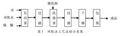 生产工艺简介如下:将部分硫脲与水按比例投入反应釜内,搅拌降温,当料液呈乳白色,温度达 5℃ 以下时,再将余下部分硫脲与双氧水按比例、分批次加入反应釜内(双氧水也可以采用滴加的方式加入到反应釜内),控制 pH 值在 3 ~5,反应温度在 10℃ 以下。当硫脲与双氧水全部加入完成后,再间歇搅拌 30 min,然后,离心甩滤,将结晶转入洗涤釜内,用配制好的脱色剂洗涤 1 ~2 次,再经离心甩滤、干燥、包装,既得二氧化硫脲成品。
