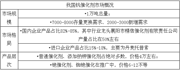 据我们调研了解,预计目前普通钒催化剂市场价格为3-4万元/吨,高端进口产品价格可达12万元/吨,整个市场规模约5亿元左右,但催化剂市场集中度非常高, 行业 龙头企业襄樊市精信催化剂有限责任公司市场份额约50%,年销量在3000吨以上,海外企业主要为丹麦托普索公司,整体看“二氧化硫氧化制酸催化剂”市场格局稳定有序。