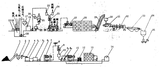 1—皮带运输机; 2—打浆桶; 3—沉砂槽; 4—转筒筛; 5—贮浆桶; 6—泵; 7—板框过滤机; 8—电动葫芦;9—酸处理桶; 10—冲洗桶; 11—过滤机; 12—干燥车; 13—干燥窑; 14—热水桶; 15—化碱槽; 16—化钒桶;17—澄清桶; 18—泵; 19—KOH和KVO3溶液贮桶; 20—高位槽; 21—蒸发器; 22—贮桶;23—计量罐; 24—硫酸计量罐; 25—中和桶; 26—混捏机; 27—挤条机; 28—链板干燥器; 29—爬车;30—干条贮斗; 31—振动筛; 32—回转窑; 33—转筒筛; 34—成品贮斗; 35—台秤