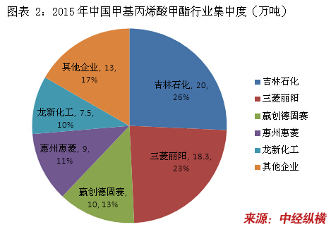 中国甲基丙烯酸甲酯 行业 集中度比较高,吉林石化公司、三菱丽阳、赢创德固赛等5家企业的产能达到64.8万吨,占到 行业 整体产能的83%以上。2015年 行业 集中度情况如下图所示: