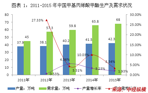 2015年中国甲基丙烯酸甲酯产量达到42.3万吨,同比增长1.9%,国内需求量达到68万吨,同比增长3.34%。2011-2015年中国甲基丙烯酸甲酯生产及需求状况如下图所示: