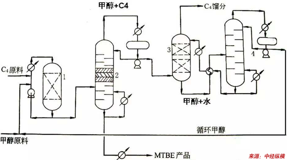 工业装置上,催化醚化反应是在固定床或膨胀床内进行的,反应物料是液相。反应后的物流中除产物MTBE之外,还有未反应的甲醇以及除异丁烯以外的其他C4组分。由于甲醇与C4或MTBE都会形成共沸物,在产物分离时可以有多种方案,如图1所示是其中的一种,图中:1—反应器;2—共沸分馏塔;3—水萃取塔;4—甲醇回收塔。在这个流程中,用三个塔在压力下进行产物分离。先在第一个塔内将甲醇与C4的共沸物蒸出,从塔底得到MTBE产物,然后用水萃取的方法从共沸物中回收甲醇,最后再从甲醇水溶液中蒸出甲醇返回反应器。反应后剩下的C4组分主要是正丁烯和异丁烷等,可作为烷基化的原料。