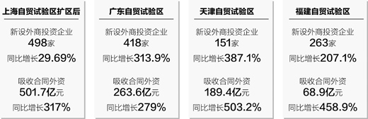 上海自贸试验区扩区后新设外商投资企业498家,同比增长29.69%,吸收合同外资501.7亿元,同比增长317%;通过备案新设外商投资企业427家,吸收合同外资309.5亿元,占比分别为85.7%和61.7%。广东自贸试验区新设外商投资企业418家,同比增长313.9%,吸收合同外资263.6亿元,同比增长279%;通过备案新设外商投资企业389家,吸收合同外资211.7亿元,占比分别为93.1%和80.3%。天津自贸试验区新设外商投资企业151家,同比增长387.1%,吸收合同外资189.4亿元,同比增长503.2%;通过备案新设外商投资企业149家,吸收合同外资188.9亿元,占比分别达到98.7%和99.7%。福建自贸试验区新设外商投资企业全部通过备案设立,共263家,同比增长207.1%,吸收合同外资68.9亿元,同比增长458.9%。