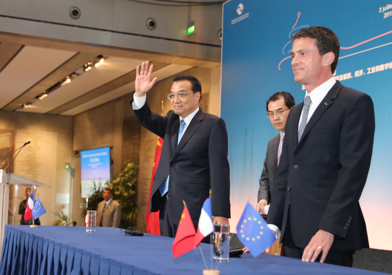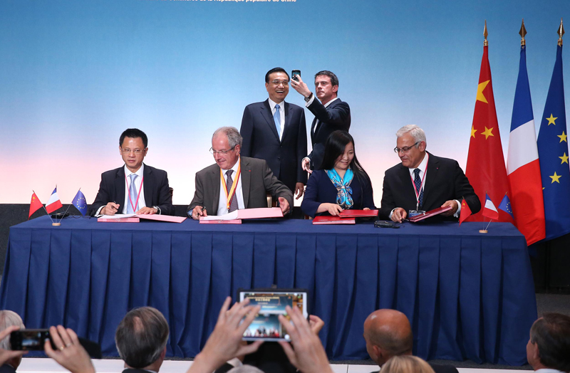 在荣军院欢迎仪式等“罕见礼遇”之后,法国总理瓦尔斯又专程来到图卢兹迎候中国总理。当地时间2日中午,瓦尔斯与李克强共同出席中法工商峰会闭幕式并致辞,还在见证双方签署22项合作协议期间主动拿起手机与总理自拍。会后,瓦尔斯再次举行午宴款待李克强一行。