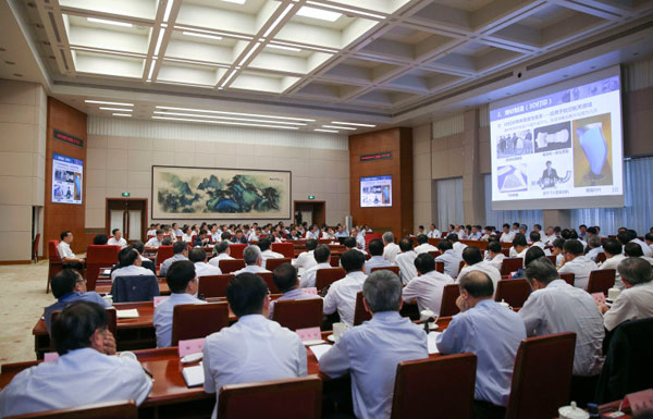 8月21日,中共中央政治局常委、国务院总理李克强主持国务院专题讲座,讨论加快发展先进制造与3D打印等问题。中共中央政治局常委、国务院副总理张高丽出席,刘延东、汪洋、马凯、杨晶、常万全、杨洁篪、郭声琨、王勇和国务院各部门、中央企业、金融机构主要负责同志参加专题讲座。(中新社 刘震 摄)